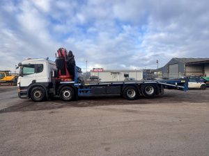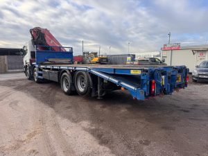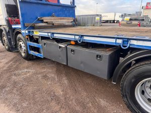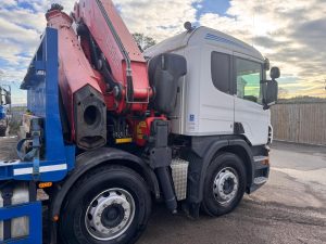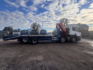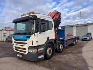2012 SCANIA P400 8X2 BEAVERTAIL WITH A 2007 FASSI F560AXP.24 CRANE. REMOTE CONTROL CRANE AND LEGS, CHEESE WEDGE BODY WITH FLIP TOE RAMPS, WINCH, MANUAL GEARBOX, SLEEPER CAB, 560,000KMS, SEPTEMBER 2026 MOT, ALL THE CAMERAS AND PEDESTRIAN SENSORS, BEACONS, VERY TIDY TRUCK READY FOR WORK